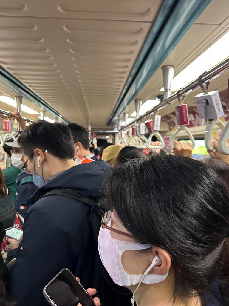 雖然我們已經盡其所能地在最靠近末端的車廂前等候,期待能有位子可以坐;但週末的捷運上總有著滿滿的人潮,我們從一上車就只剩還算舒服不太擁擠的站立空間。